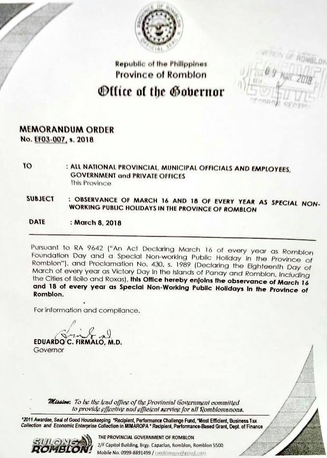 Sa Memorandum Order No. EF03-007 s. 2018 na nilabas ng Office of the Governor nitong March 08, sinabi rito na alinsunod ito sa Republic Act 9642 "An Act Declaring March 16 of Every Year as Romblon Foundation Day and a Special Non-Working Public Holiday in the Province of Romblon" at Proclamation No. 430, s. 1989.