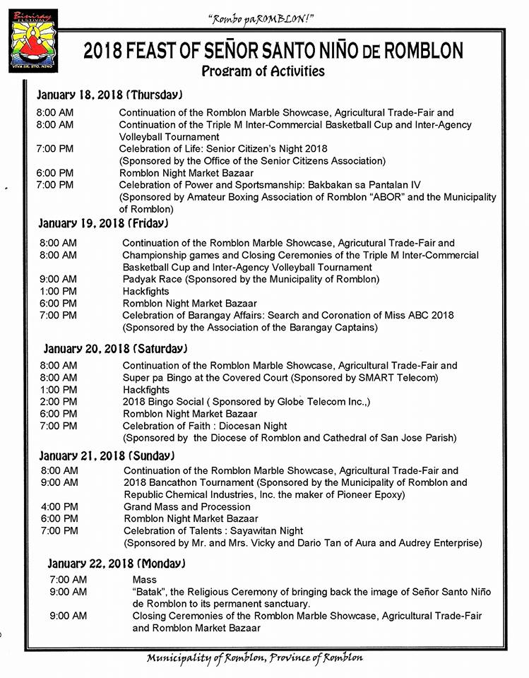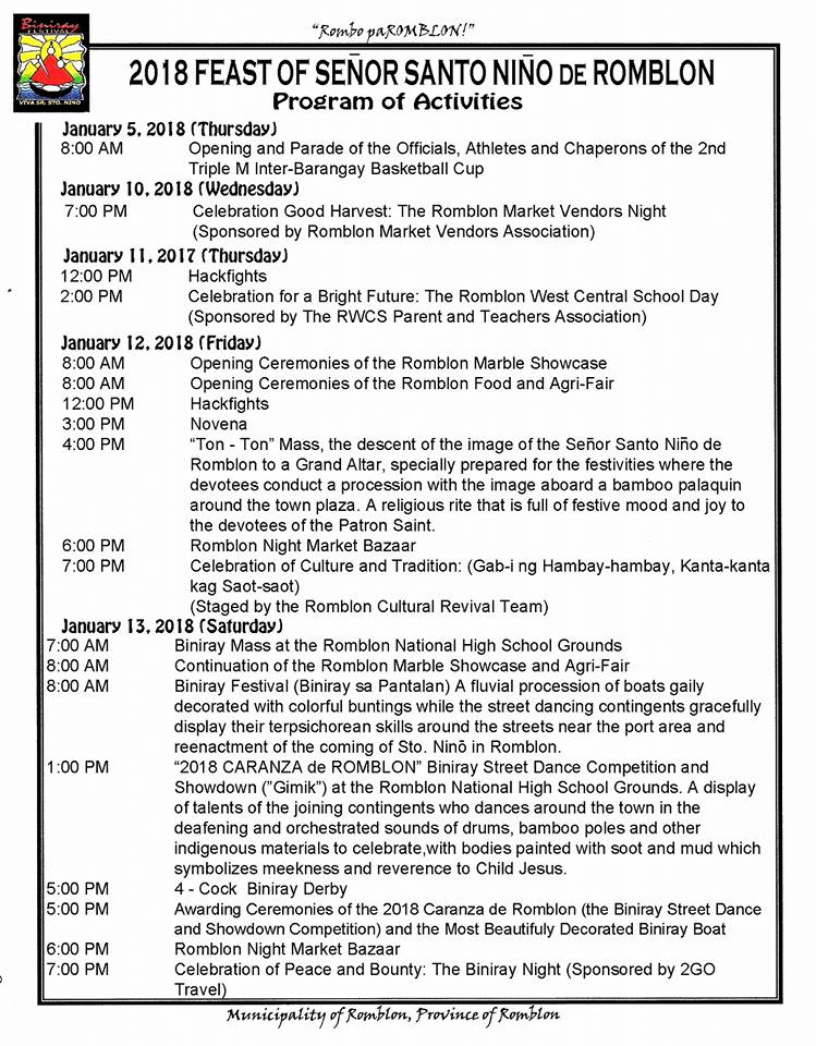 Schedule of Romblon's Biniray Festival 2018 Published: 04 January 2018 Written by Romblon News TwitterNarito ang schedule ng mga aktibidad para sa gaganaping Biniray Festival 2018 sa bayan ng Romblon, Romblon ngayong January. Author: Romblon NewsWebsite Administrator More Articles from the Author Mabilis at malapit mag-withdraw sa Cash Agad ng BDOYouth Eco-Warrior mula sa Romblon naghain ng CONA para sa Partylist Election sa 2022Philippine vice president Robredo files candidacy for presidential electionW. Visayas bishops add voices against Boracay casinoFacebook services restored after worldwide outage