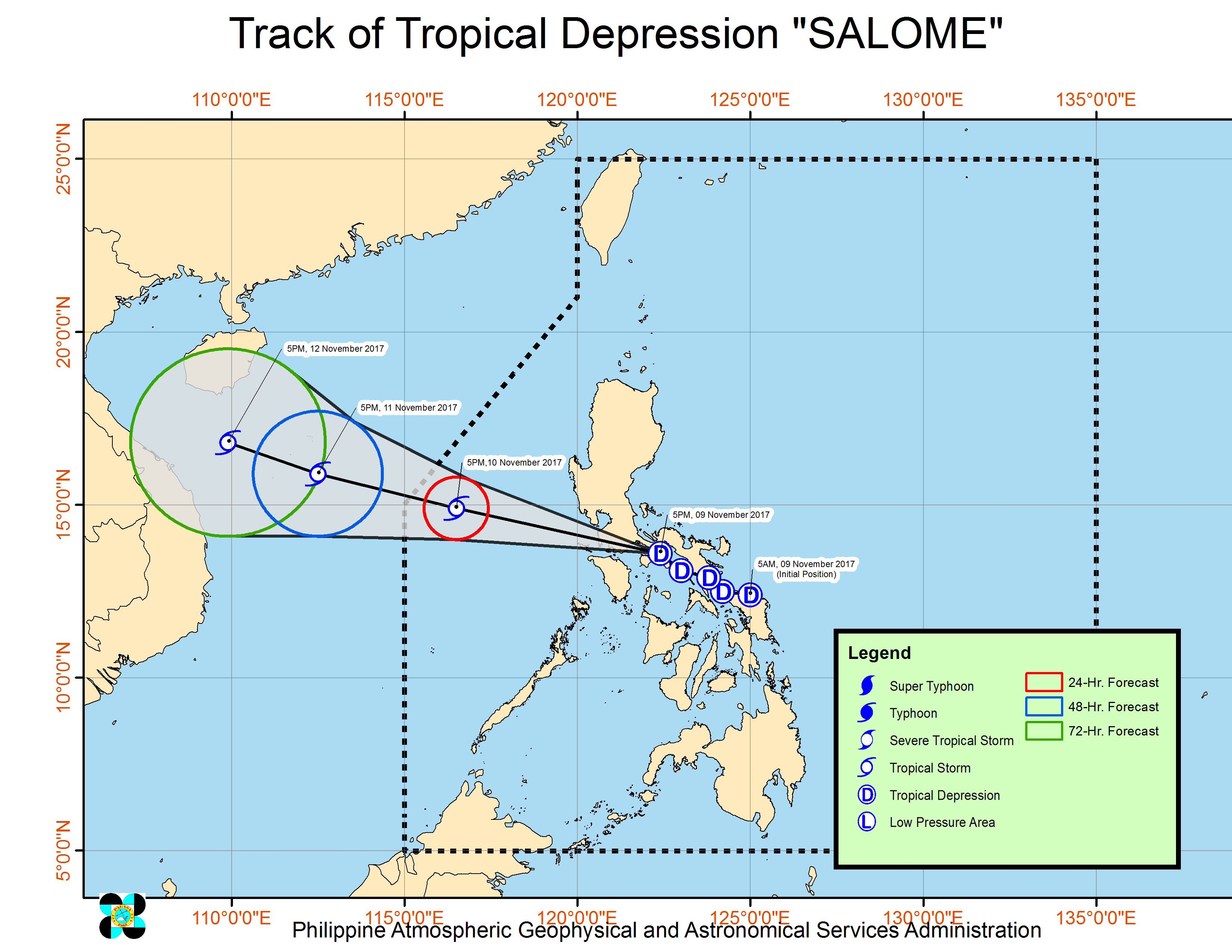 Ayon sa 2AM Weather Bulletin (November 10) ng Philippine Atmospheric, Geophysical and Astronomical Services Administration (PAGASA), as of 1AM ay nasa layong 75km West Northwest ito ng Ambulong Batangas. Bahagyang lumakas ang bagyo at ngayo'y taglay na ang lakas na 65kph malapit sa gitna at 110kph na bugso ng hangin.