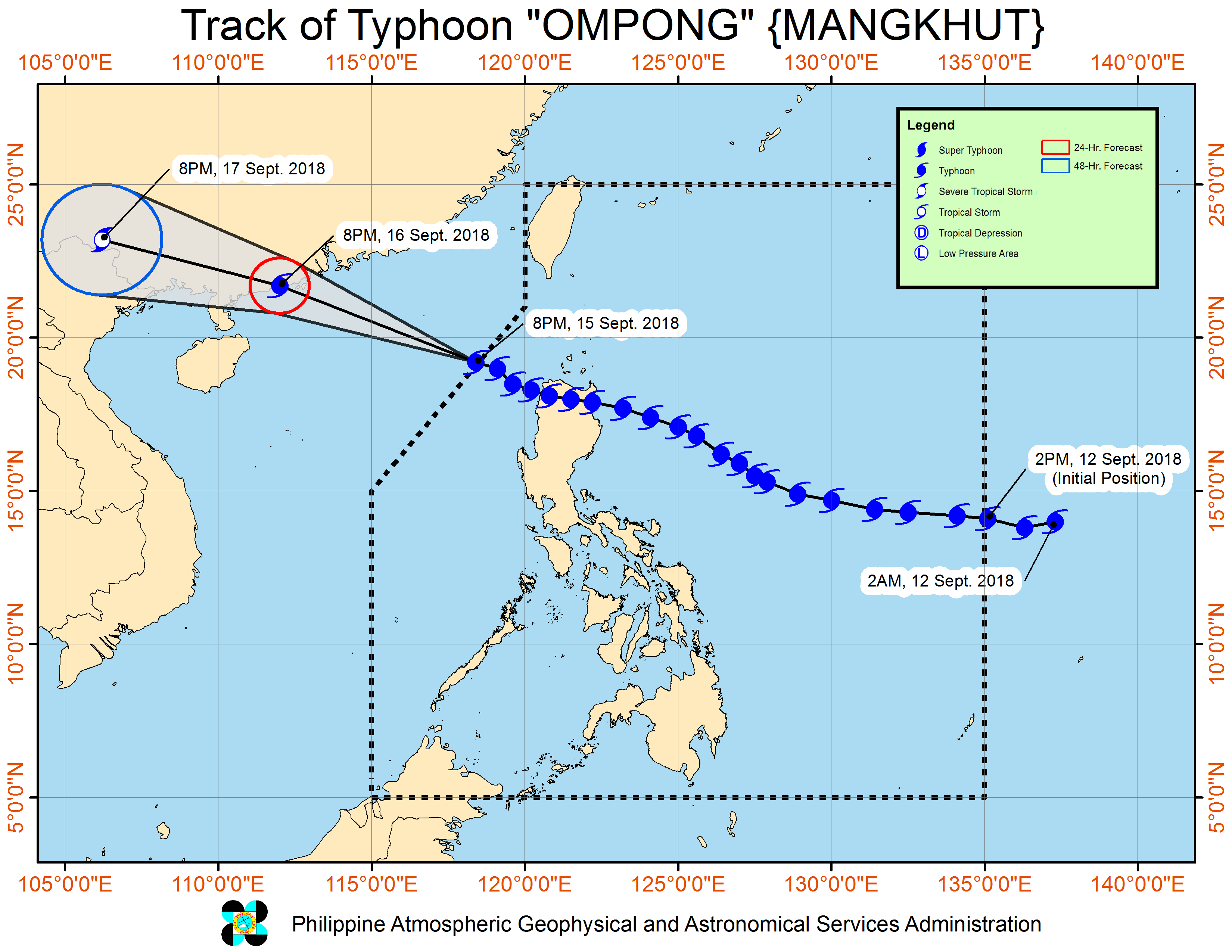 Meanwhile, PAGASA said the southwest monsoon enhanced by "Ompong" will bring gusty winds with occasional moderate to heavy rains over western Visayas and Mimaropa.