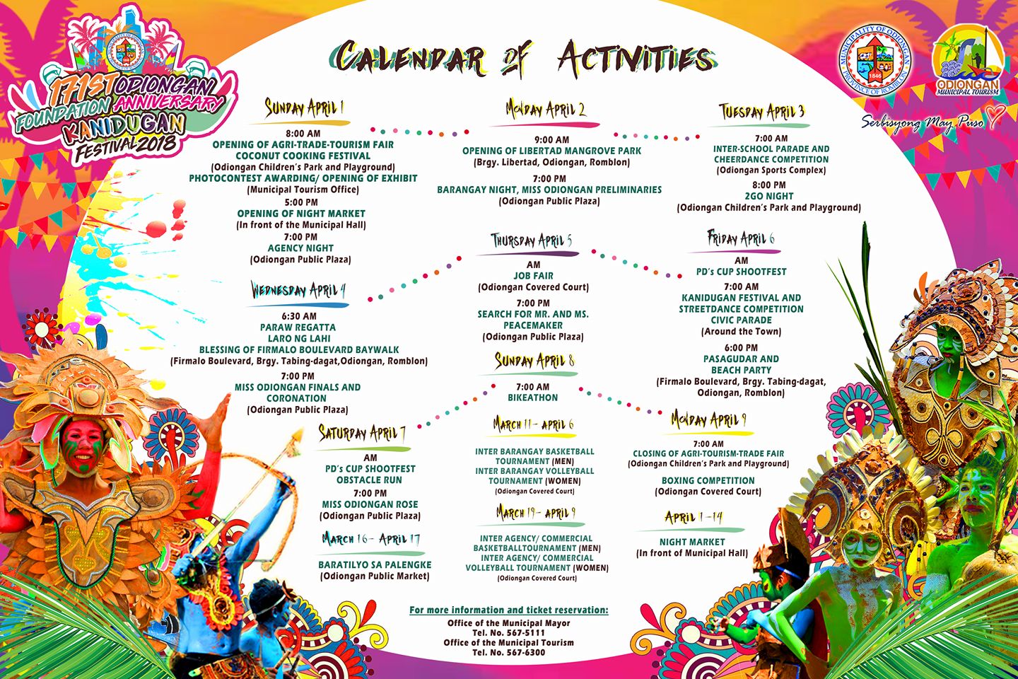 LOOK: Calendar of Activities ng Kanidugan Festival 2018 Published: 05 March 2018 Written by Paul Jaysent Fos | Romblon News Twitter Narito ang calendar of activities ng taunang Kanidugan Festival 2018 at 171st Foundation Day ng Odiongan, Romblon. Author: Paul Jaysent Fos | Romblon NewsSenior News Editor More Articles from the Author 3k food packs tianggap ng Simara at Sibale mula sa DSWD, One RomblonSan Jose LGU may bagong ambulansya'Duterte Legacy' campaign provincial launch set in OdionganPfizer vaccines, nakarating na sa mga malalayong isla sa Romblon100 oxygen tanks mula DOH-Mimaropa, dumating sa Romblon