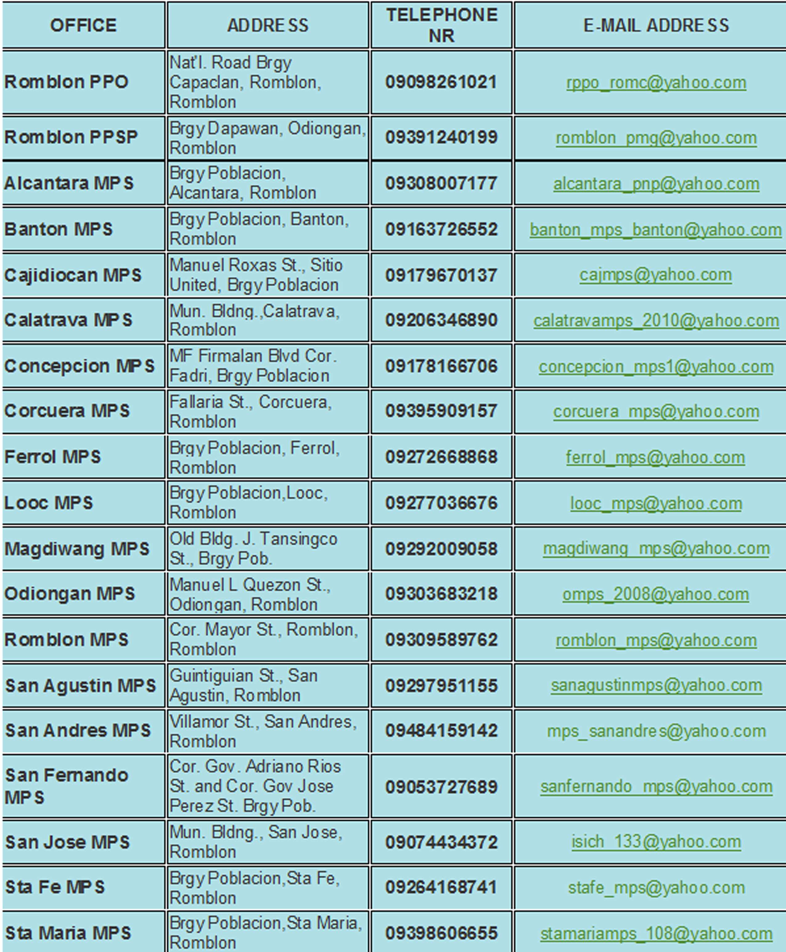 Need help? Narito ang mga contacts ng Police Stations sa Romblon Published: 09 September 2016 Written by Romblon News TwitterKailangan niyo bang kontakin ang mga istasyon ng pulisya na pinakamalapit sa inyo? Narito ang address, mobile numbers, at email address ng mga Police Stations sa lalawigan ng Romblon na inipon ng Romblon News Network. Author: Romblon NewsWebsite Administrator More Articles from the Author Mabilis at malapit mag-withdraw sa Cash Agad ng BDOYouth Eco-Warrior mula sa Romblon naghain ng CONA para sa Partylist Election sa 2022Philippine vice president Robredo files candidacy for presidential electionW. Visayas bishops add voices against Boracay casinoFacebook services restored after worldwide outage