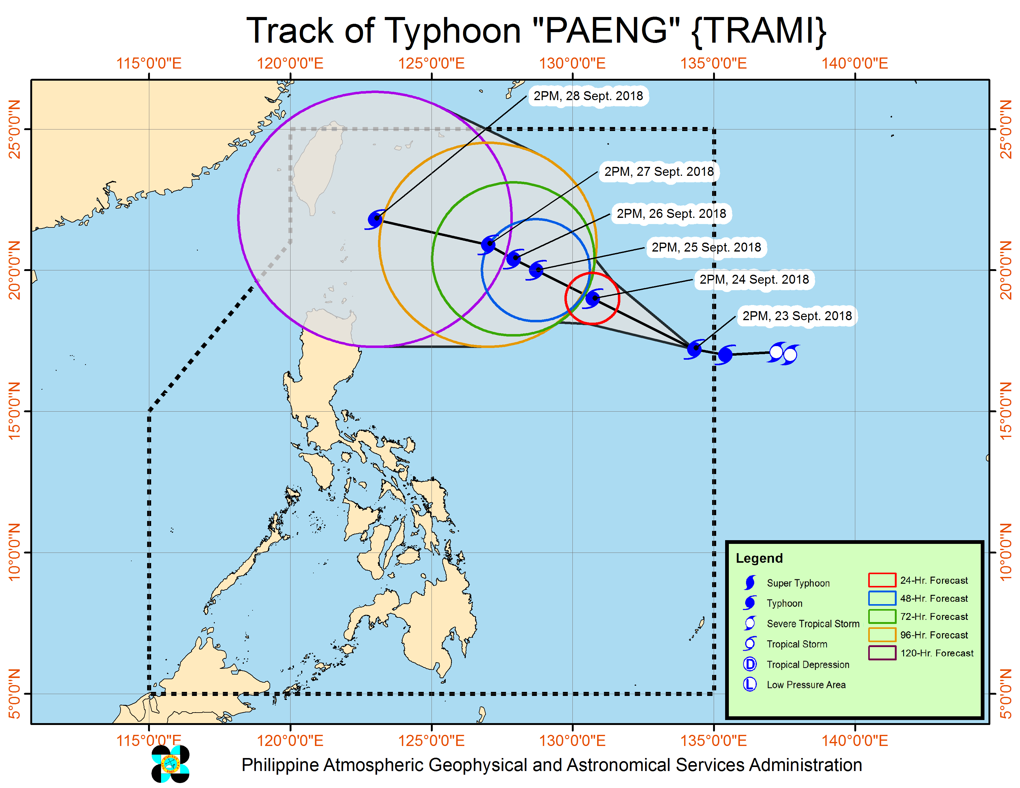 It forecast the typhoon to be at 960 km east of Tuguegarao City, Cagayan by Monday afternoon, to be 705-525 km east of Basco, Batanes from Tuesday to Thursday afternoon, to 185 km northeast of Basco, Batanes by Friday afternoon.