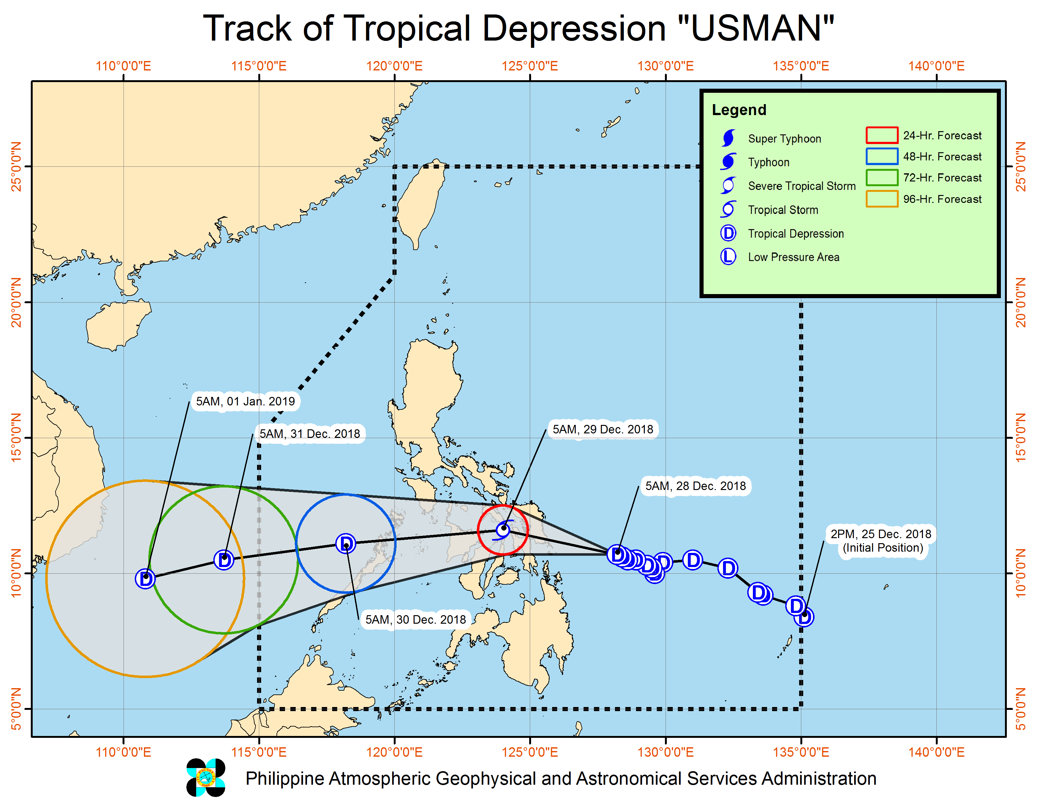 At 7 a.m., “Usman” was last observed at 250 kilometers east of Guiuan, Eastern Samar with maximum winds of 55 kilometers per hour (kph) near the center and gustiness of up to 65 kph while moving west northwest at 10 kph.