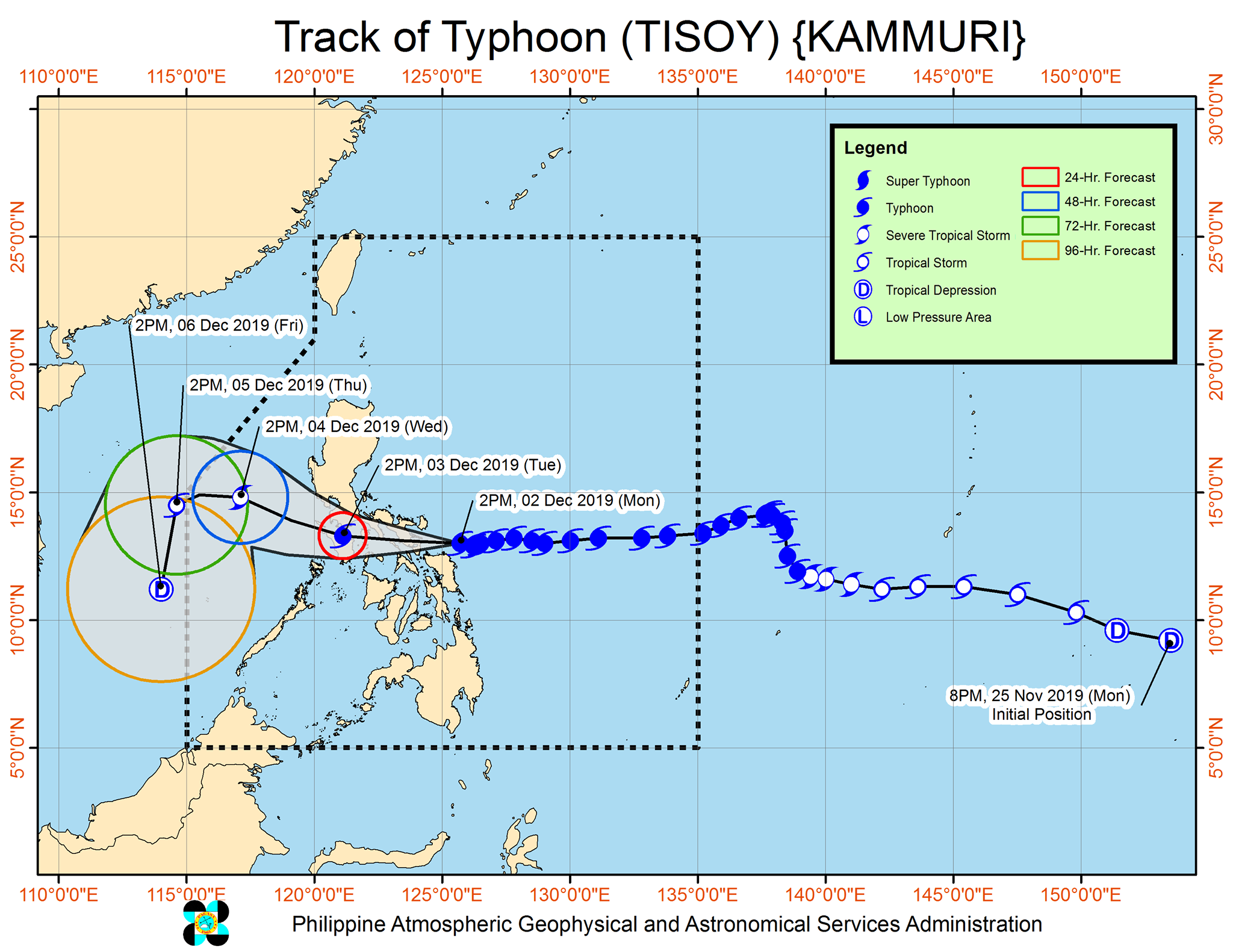 Huling namataan nila si Tisoy sa layong 155km East ng Juban, Sorsogon at taglay ang lakas ng bagyong may 155 kph malapit sa gitna at bugsong aabot sa 190 kph.