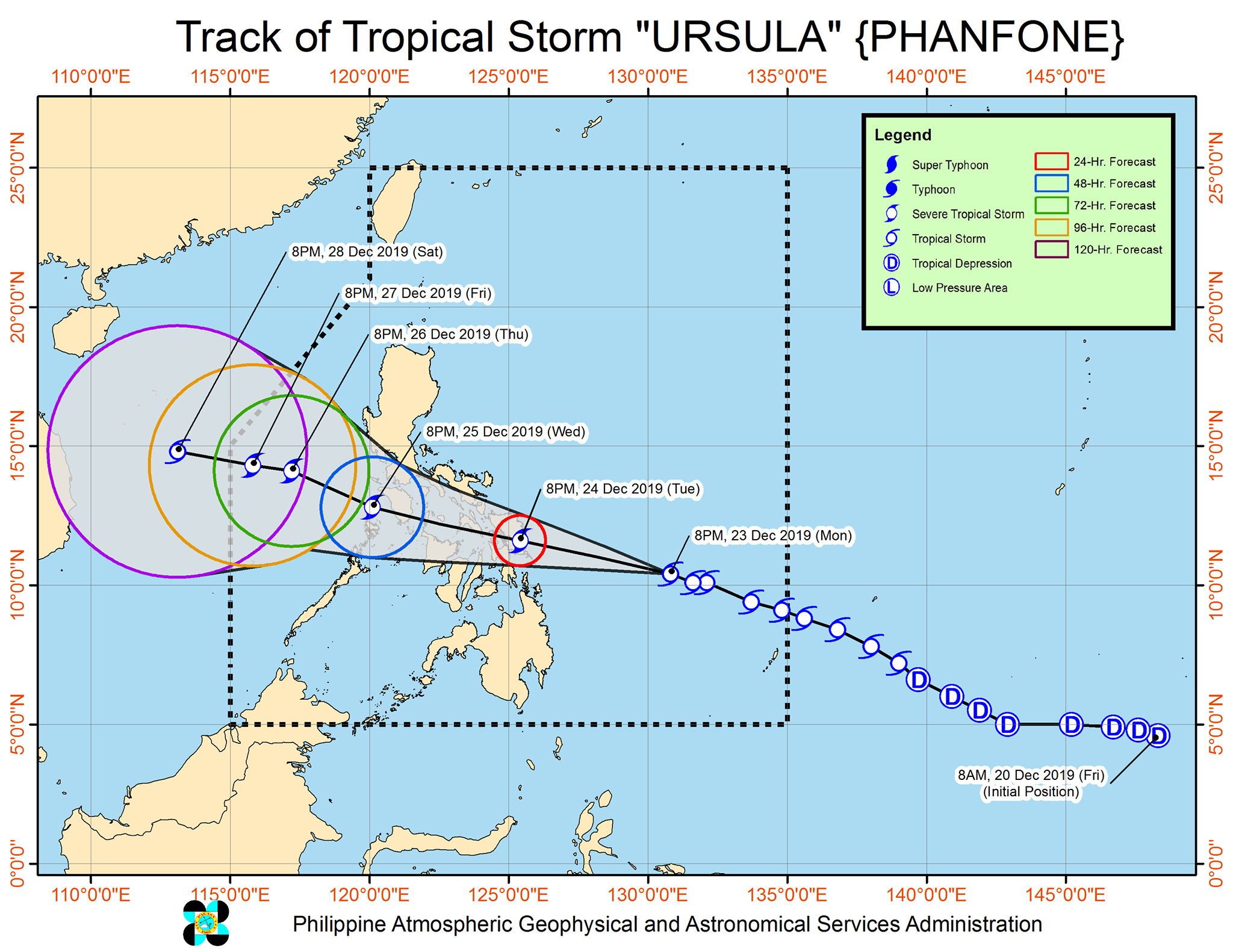 Huling namataan si Ursula sa layong 505 km ng Guiuan, Eastern Samar. Lumakas pa ang bagyo at ngayo'y may dalang hanging aabot na sa 85 km/h malapit sa gitna at bugsong aabot hanggang 105km/h.