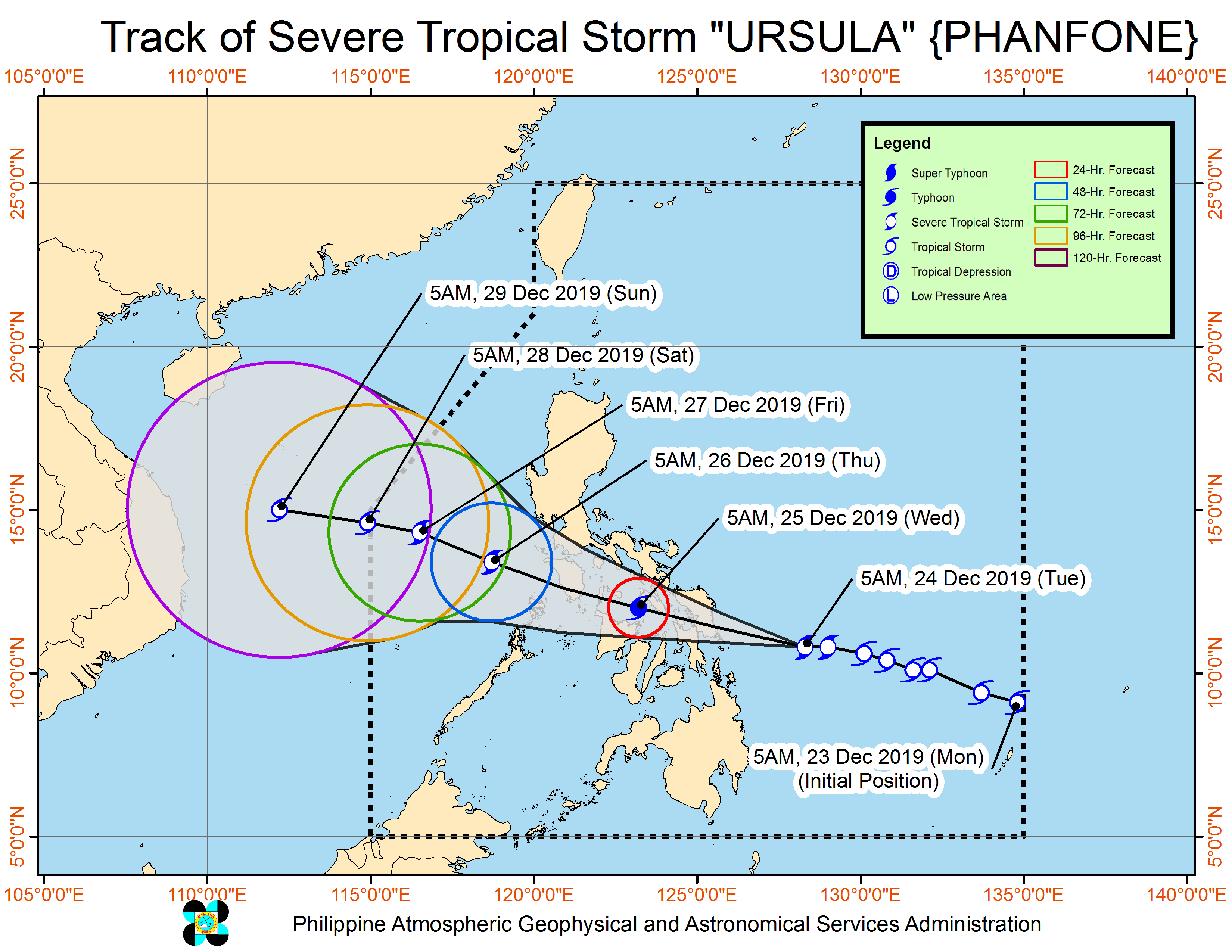 Huling namataan ng Philippine Atmospheric, Geophysical and Astronomical Services Administration (Pagasa) ang sentro ng mata ng bagyo sa layong 250 km East of Guiuan, Eastern Samar taglay ang lakas ng hangin na 100 kp/h malapit sa gitna at bugsong aabot sa 125 kp/h. Gumagalaw itong West sa bilis na 30 kp/h.