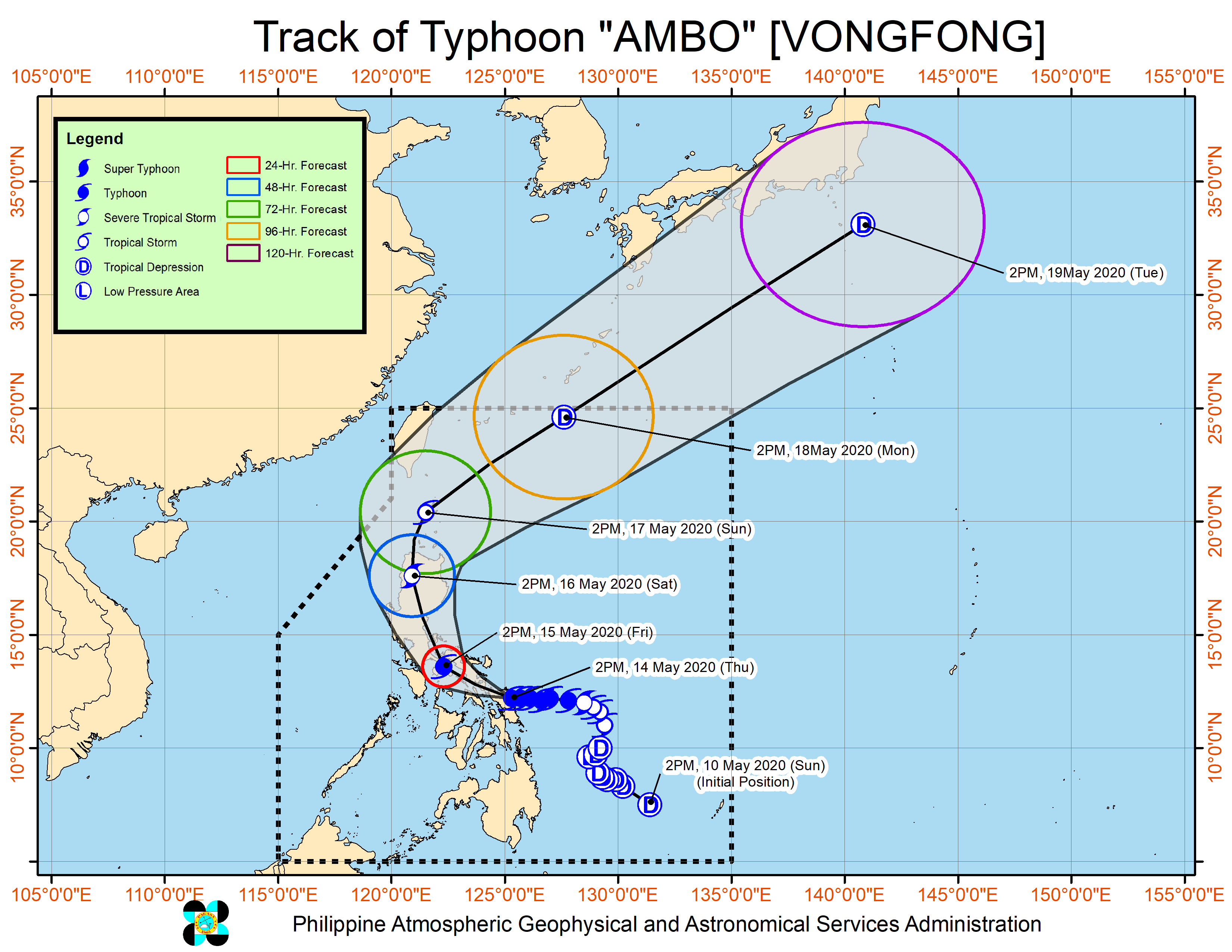Huling namataan ng ahensya ang bagyong #AmboPH sa vicinity ng San Jose De Buan, Samar taglay ang lakas ng hangin na 155 kp/h malapit sa gitna, at bugsong aabot sa 255 kp/h.