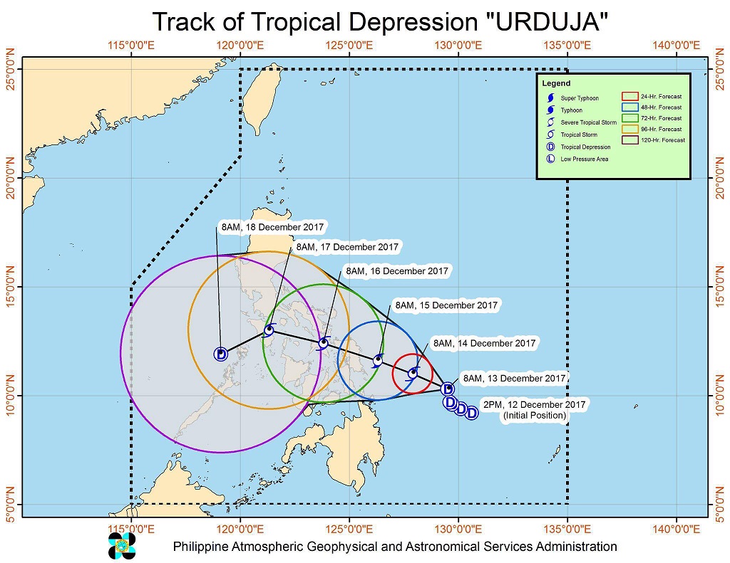 Huling namataan ng Philippine Atmospheric, Geophysical and Astronomical Services Administration (PAGASA) ang sentro ng bagyong Urduja ngayong 10AM ng December 10 sa layong 405km East ng Guiuan, Eastern Samar.
