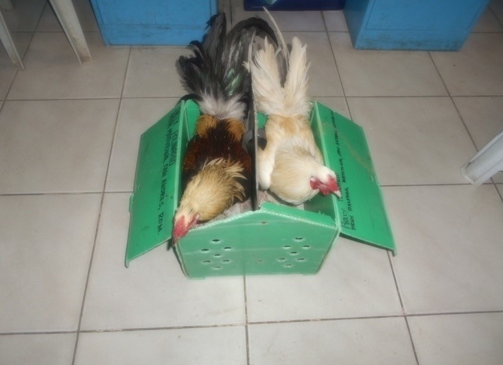Nakuha sa mga suspek ang P200.00 na bet money, dalawang manok pansabong, at isang tari para sa manok.