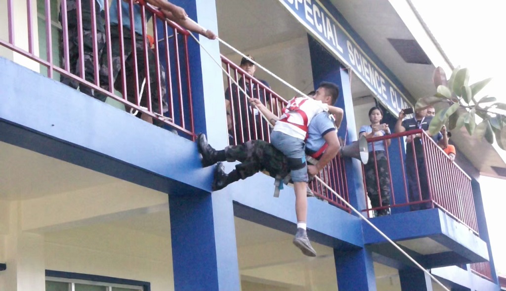 Dalawa sa mga estudyante ang ibinababa nga mga tauhan ng PNP galing kunyari sa 2nd floor na nasirang school building gamit ang lubid.