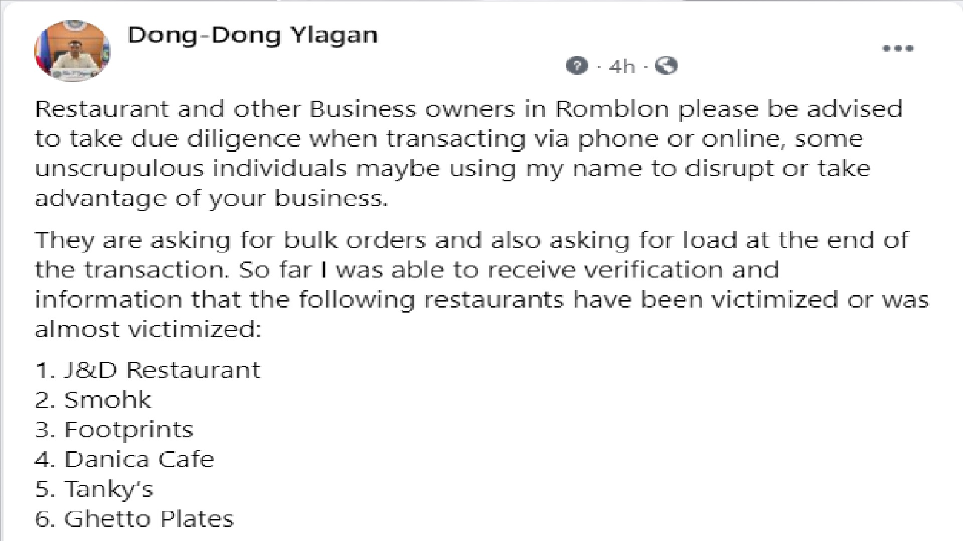 "Restaurant and other Business owners in Romblon please be advised to take due diligence when transacting via phone or online, some unscrupulous individuals maybe using my name to disrupt or take advantage of your business," babala ng bise gobernador.