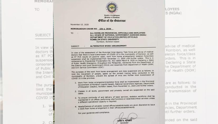 Suspendido pa rin bukas, November 11, hanggang sa susunod na abiso ang klase sa lahat ng antas ng pribado at pampublikong paaralan sa bayan ng Romblon dahil sa banta ng coronavirus disease 2019 o Covid-19.