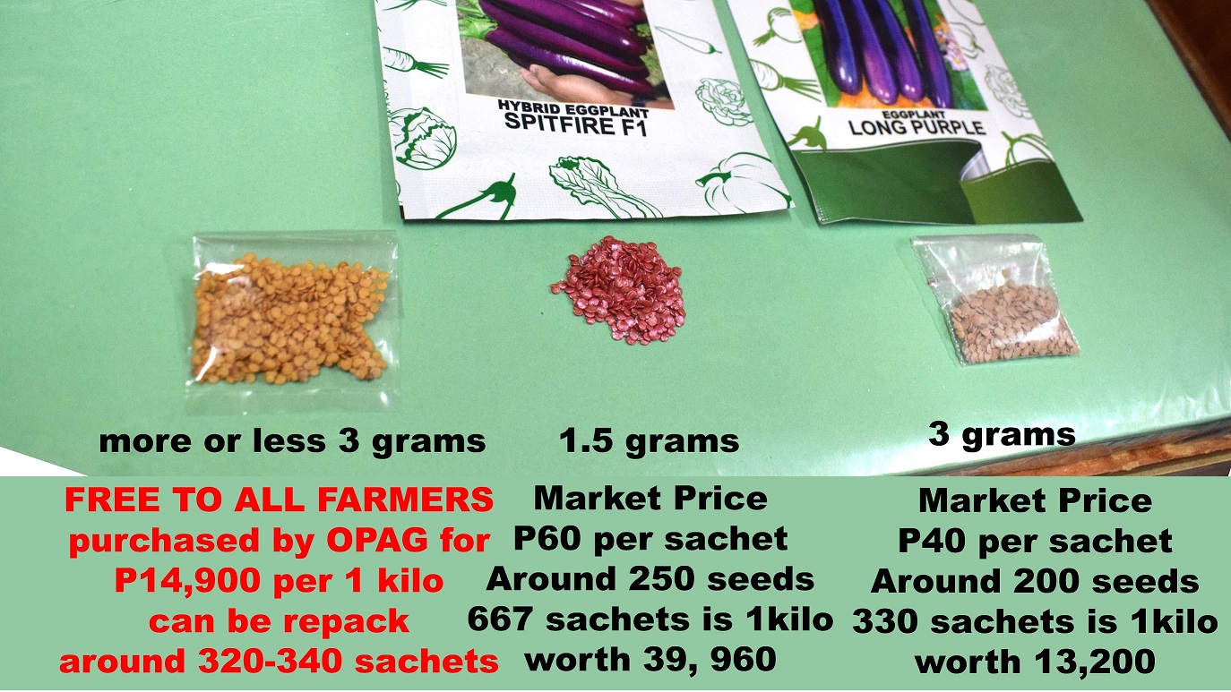 "Yung nabibili sa labas na isang sachet ng Hybrid Eggplant na 1.5 grams lang ang laman ay P60 na ang presyo, so kung ginawa mong isang kilo yun, sobrang mahal na yun. Meron ring P40 per sachet, na 3 grams kaso mas malalaki ang buto niya kaya mas kakaunti ang matatanim," paliwanag ni Diokno.