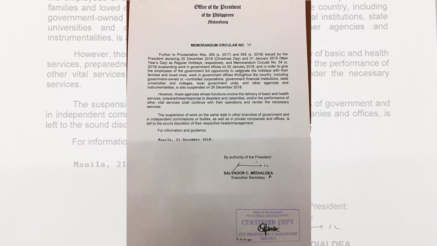 “Further to Proclamation Nos. 269 (s. 2017) and 555 (s. 2018) issued by the President declaring 25 December 2018 (Christmas Day) and 01 January 2019 (New Year’s Day) as Regular Holidays, respectively, and the Memorandum Circular No. 54 (series of 2018) suspending work in government offices on 02 January 2019, and in order to give the employees of the government full opportunity to celebrate the holidays with their families and loved ones, work in government offices, throughout the country, including government-owned or -controlled corporation, government financial institutions, state universities and colleges, local government units, and other agencies and instrumentalities, is hereby suspended on 26 December 2018,” the memorandum read.