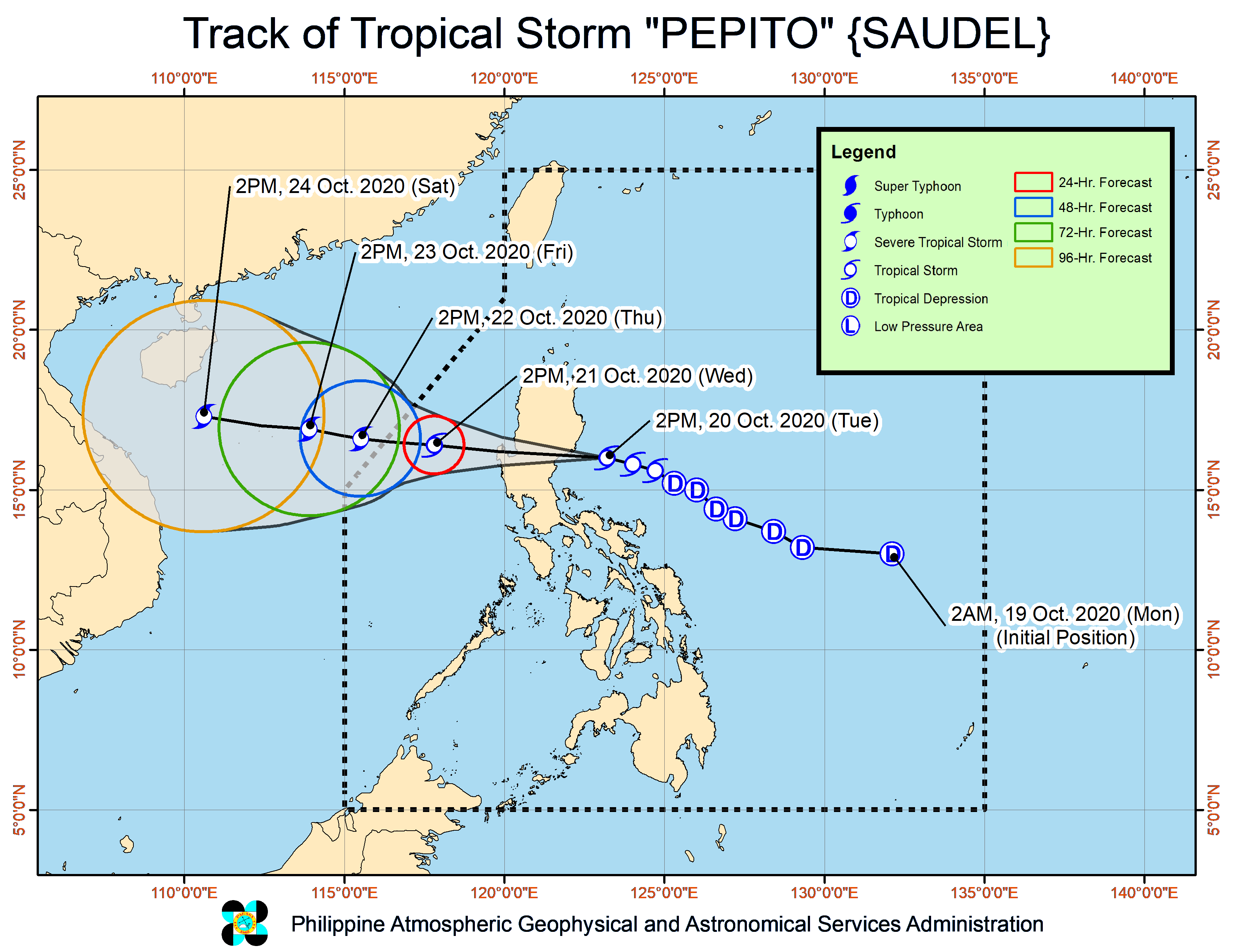 PAGASA maintained that Pepito may reach the severe tropical storm category by Thursday, but also forecast to exit the Philippine Area of Responsibility (PAR) on that day.