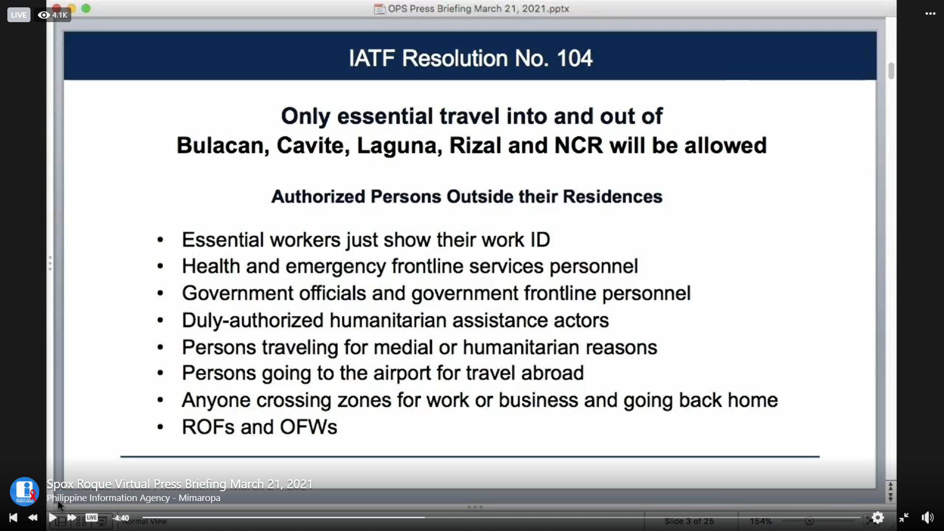 Roque said that only authorized persons outside their residences will be allowed such as essential workers, health and emergency frontline services personnel, gov't officials and gov't frontline personnel, duly-authorized humanitarian assistance actors, persons travel for medical or humanitarian reasons, persons going to the airport for abroad, anyone crossing zones for work or business and going back home, and ROFs and OFWs.