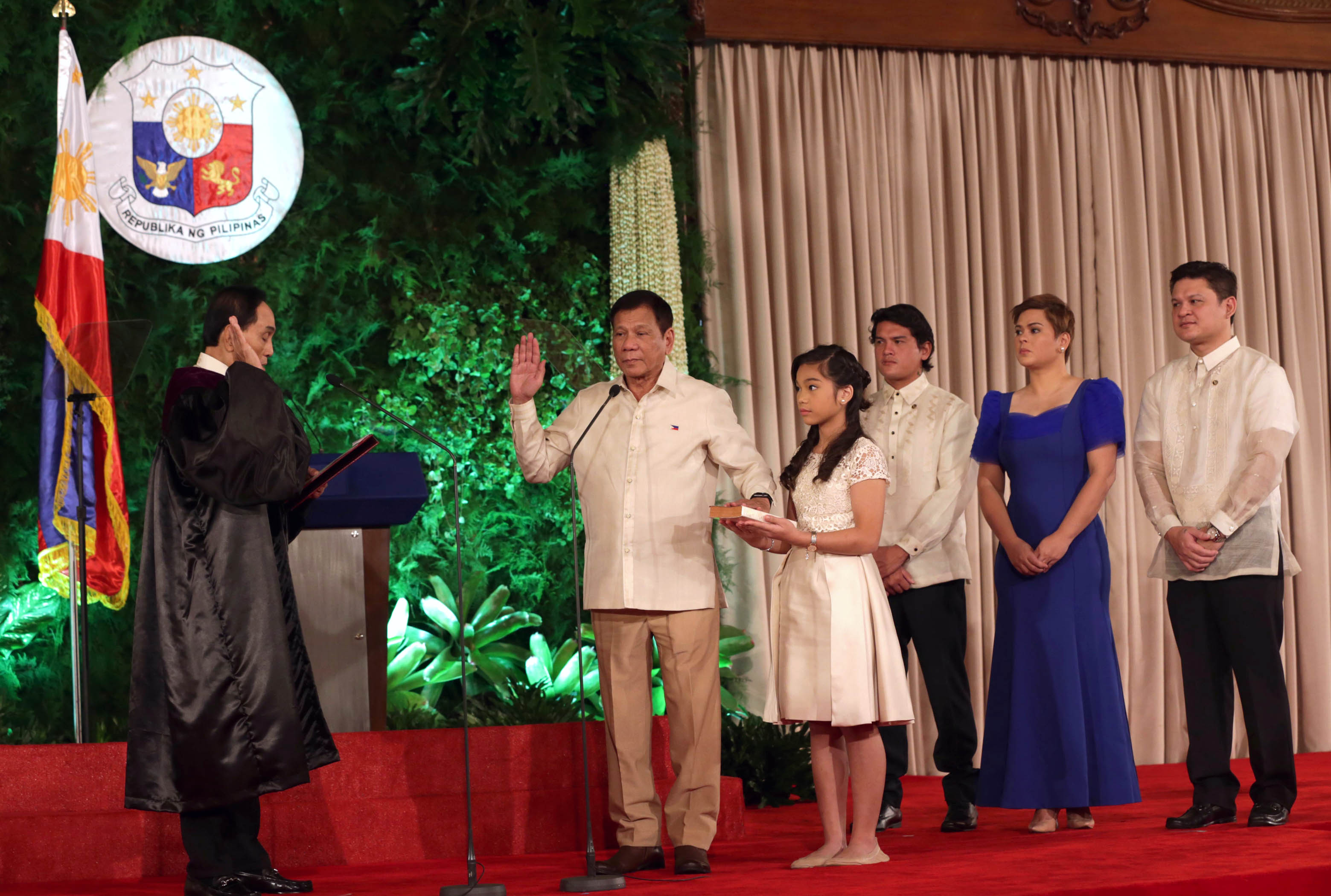 In a simple ceremony attended by around 600 guests at the Rizal Hall in Malacañang Palace, Duterte was sworn in by Supreme Court Associate Justice Bienvenido Reyes, with his left hand placed on top of the Bible held by his youngest daughter, Veronica.