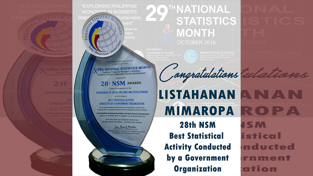 Binigyan ng parangal sa katatapos lang na 29th National Statistics Month (NSM) ang Department of Social Welfare and Development (DSWD) MIMAROPA Field Office at ito ay ang 'Best Statistical Activity Conducted by a Government Organization'.