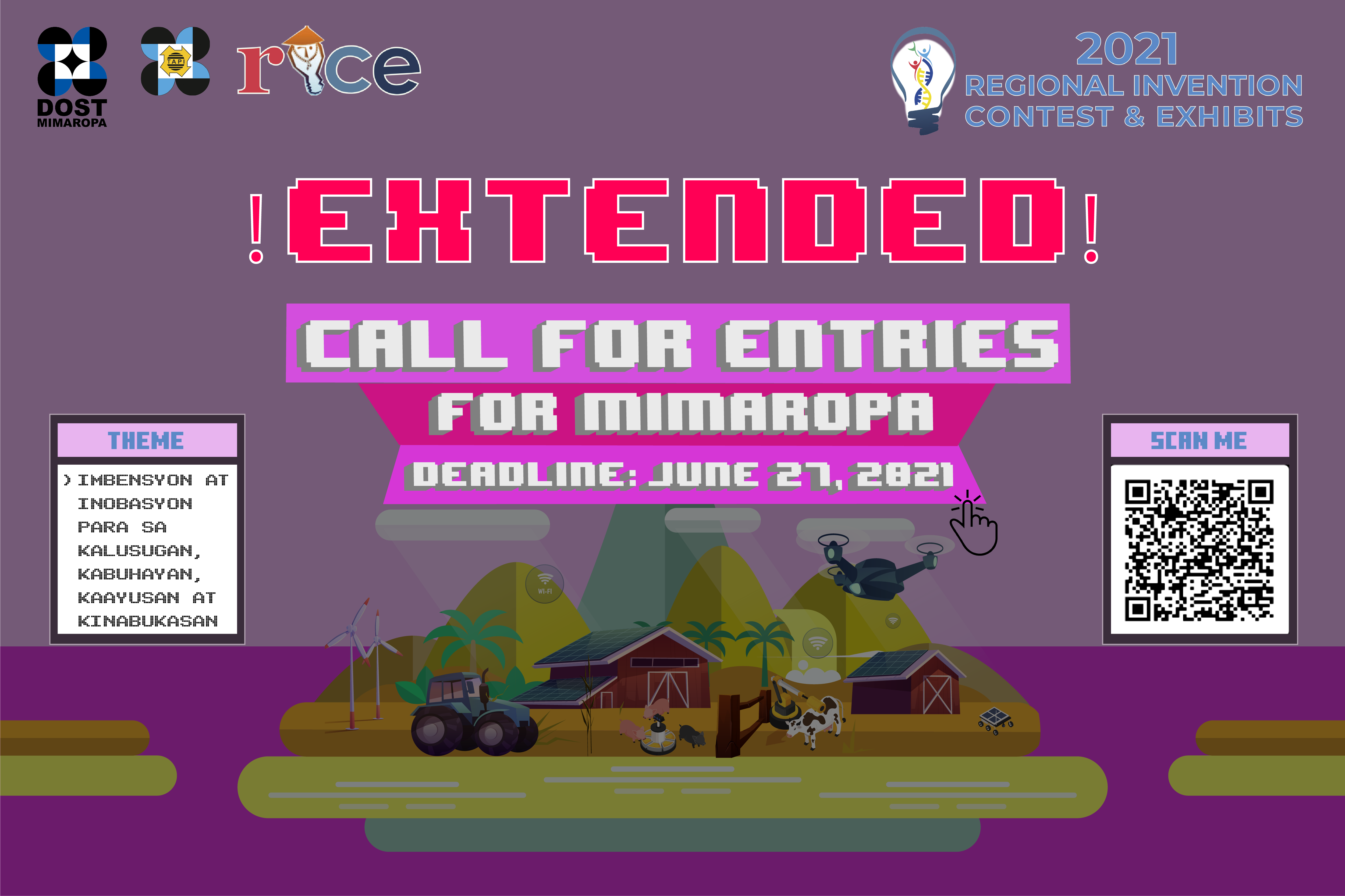 Pinalawig ng Department of Science and Technology-MIMAROPA (DOST-MIMAROPA) at Technology Application and Promotion Institute (DOST-TAPI) ang deadline sa pagsusumite ng mga entries para sa 2021 Regional Invention Contest and Exhibits (RICE) sa MIMAROPA hanggang June 27, 2021.