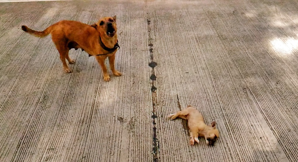 Bigla namang dumating ang isa pang aso na malamang ay ina ng nasalpuk na tuta, tumatahol ito na para bang humihingi ng tulong na sana makaligtas ang anak niya sa kamatayan.