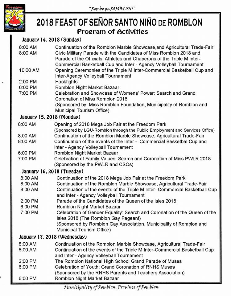 Schedule of Romblon's Biniray Festival 2018 Published: 04 January 2018 Written by Romblon News TwitterNarito ang schedule ng mga aktibidad para sa gaganaping Biniray Festival 2018 sa bayan ng Romblon, Romblon ngayong January. Author: Romblon NewsWebsite Administrator More Articles from the Author Mabilis at malapit mag-withdraw sa Cash Agad ng BDOYouth Eco-Warrior mula sa Romblon naghain ng CONA para sa Partylist Election sa 2022Philippine vice president Robredo files candidacy for presidential electionW. Visayas bishops add voices against Boracay casinoFacebook services restored after worldwide outage