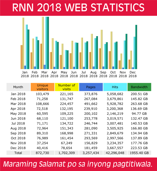 Ang RNN 2018 Web Statistics na nagpapakita ng halos 1 million unique visitors, 2 million visits, at mahigit 42 million hits ay nagpapatunay lamang ng mataas na pagtitiwala at pagtangkilik ng mga Romblomanons sa buong mundo.