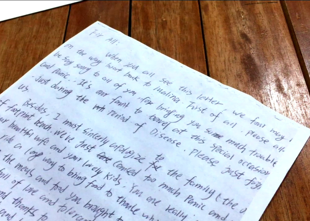 "Please allow be say sorry to all of you, for bringing you so much trouble and panic. It's our fault to travel at this special occasion just during the period of disease. Please just forgive us. (Mangyaring hayaan niyo kaming humingi ng pasensya sa inyong lahat, sa pagdadala sa inyo ng napakaraming problema at takot. Kasalanan namin na maglakbay sa ganitong panahon lalo na sa panahon nitong sakit. Patawarin niyo lang kami.)" ayon sa liham ng isa sa apat na Chinese national.
