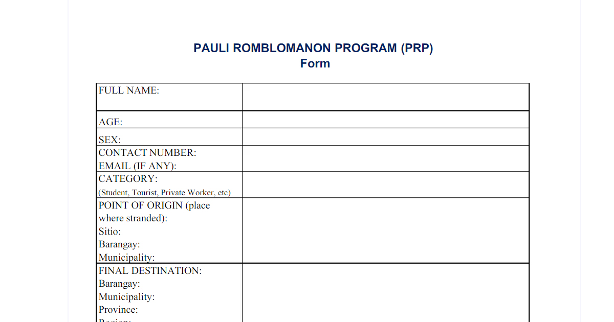 Download FORM: Pauli Romblomanon Program Published: 28 May 2020 Written by Paul Jaysent Fos | Romblon News Twitter Narito ang form ng Pauli Romblomanon Program ng Provincial Gov't ng Romblon na dapat niyo na sagutan para makauwi ng probinsya. Pauli Romblomanon Program Form by Romblon News Network on Scribd Author: Paul Jaysent Fos | Romblon NewsSenior News Editor More Articles from the Author 3k food packs tianggap ng Simara at Sibale mula sa DSWD, One RomblonSan Jose LGU may bagong ambulansya'Duterte Legacy' campaign provincial launch set in OdionganPfizer vaccines, nakarating na sa mga malalayong isla sa Romblon100 oxygen tanks mula DOH-Mimaropa, dumating sa Romblon