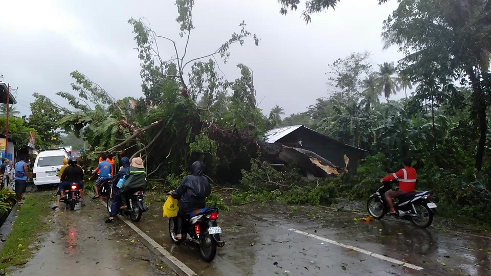 Sa kasagsagan ng malakas na hangin, isang matandang puno ng acacia ang bumalandra sa gitna ng national road na bahagi ng Barangay Libertad sa bayan ng Odiongan sa Romblon.