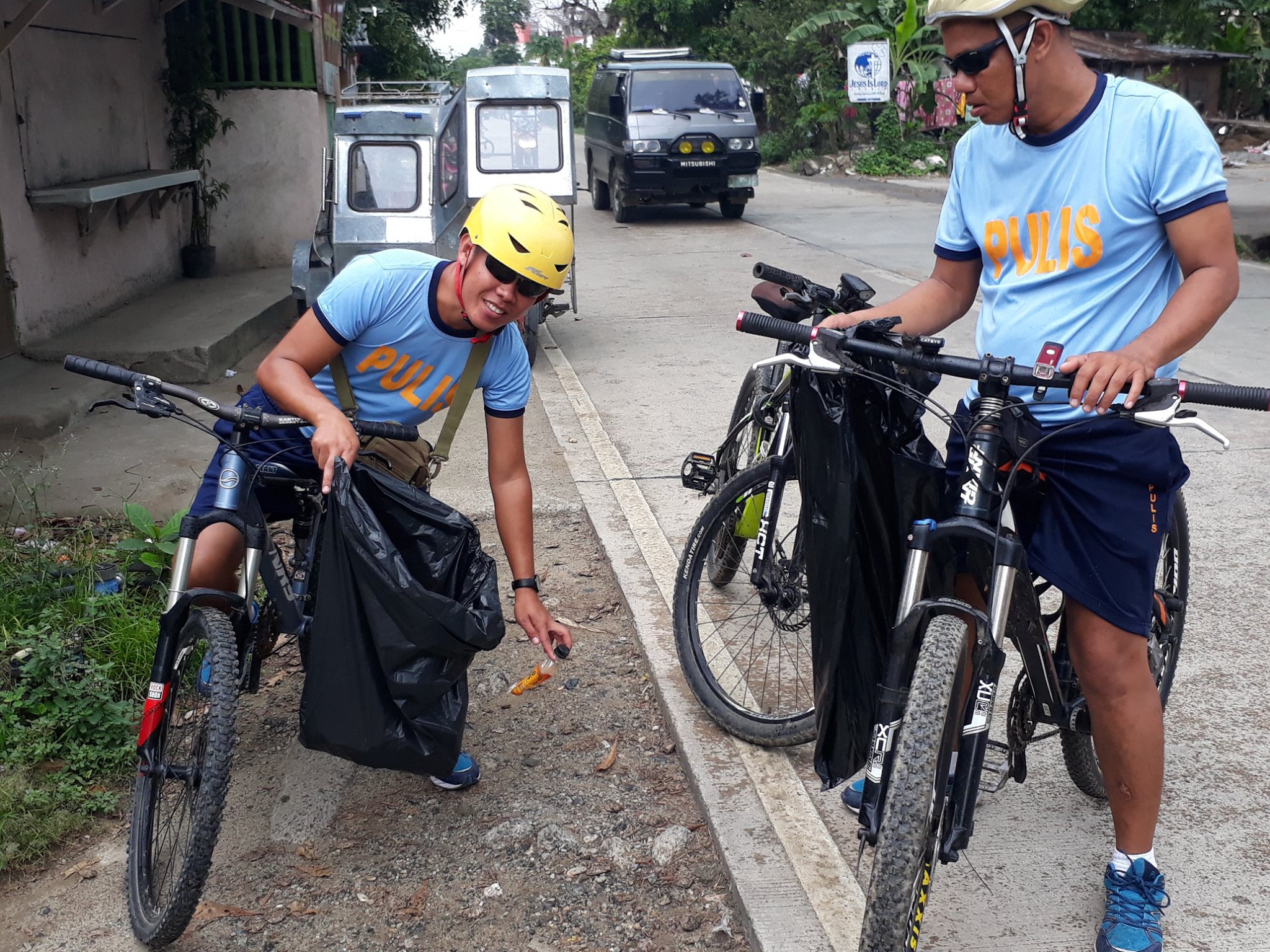 Dala-dala ng tatlong pulis ang isang trash bags habang sakay sila ng kanilang mountain bikes at nag-ikot sa Odiongan.