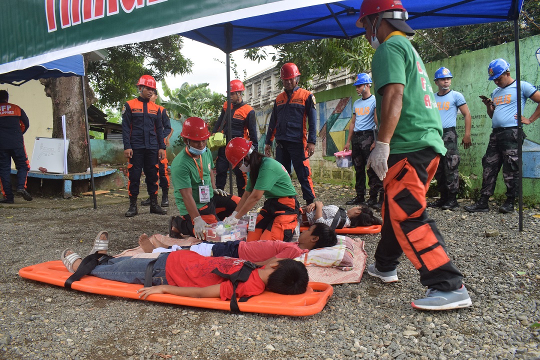 Ang isa sa mga bata, kunwari ay may sugat at isa sa kanila ay nabaliaan na kailangan pang isakay ng stretcher para dalhin sa triage area kung saan ginamot ng mga nurse ng Rural Health Unit.