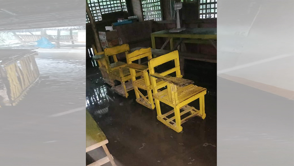 Sa mga litrato ng pahayagang Romblon Post, makikita ang mga upuan sa nasabing paaralan na lubog na sa baha.